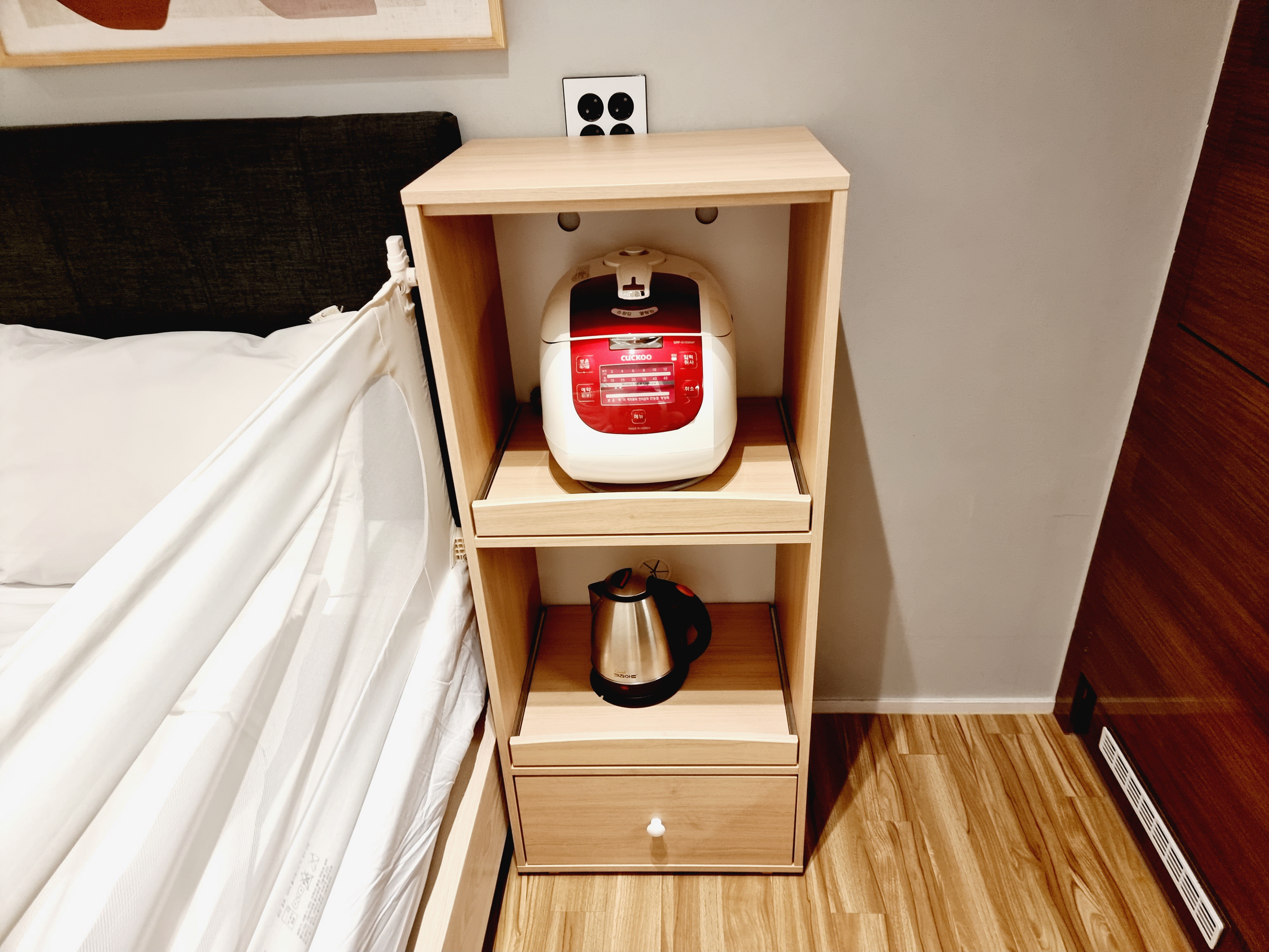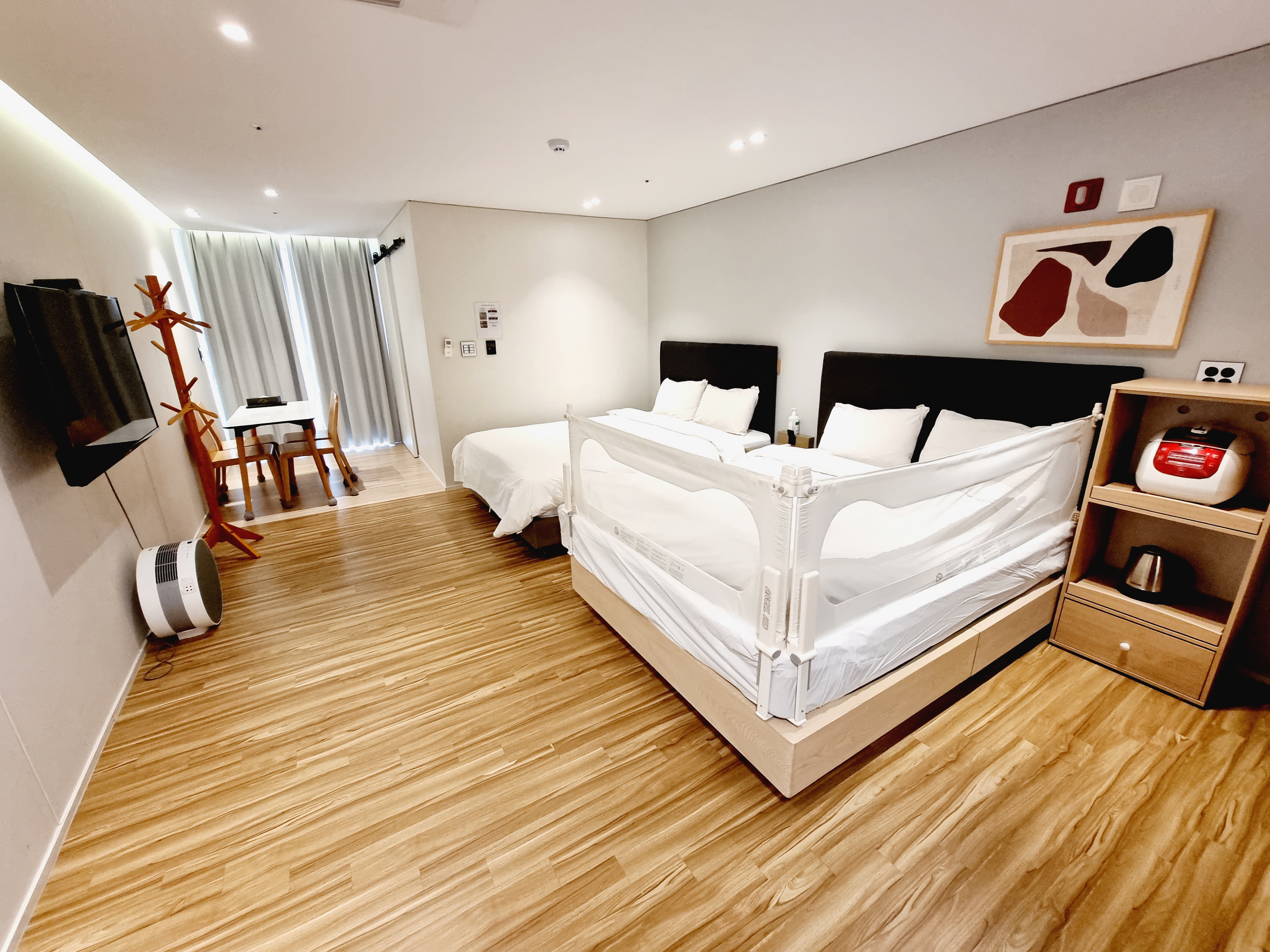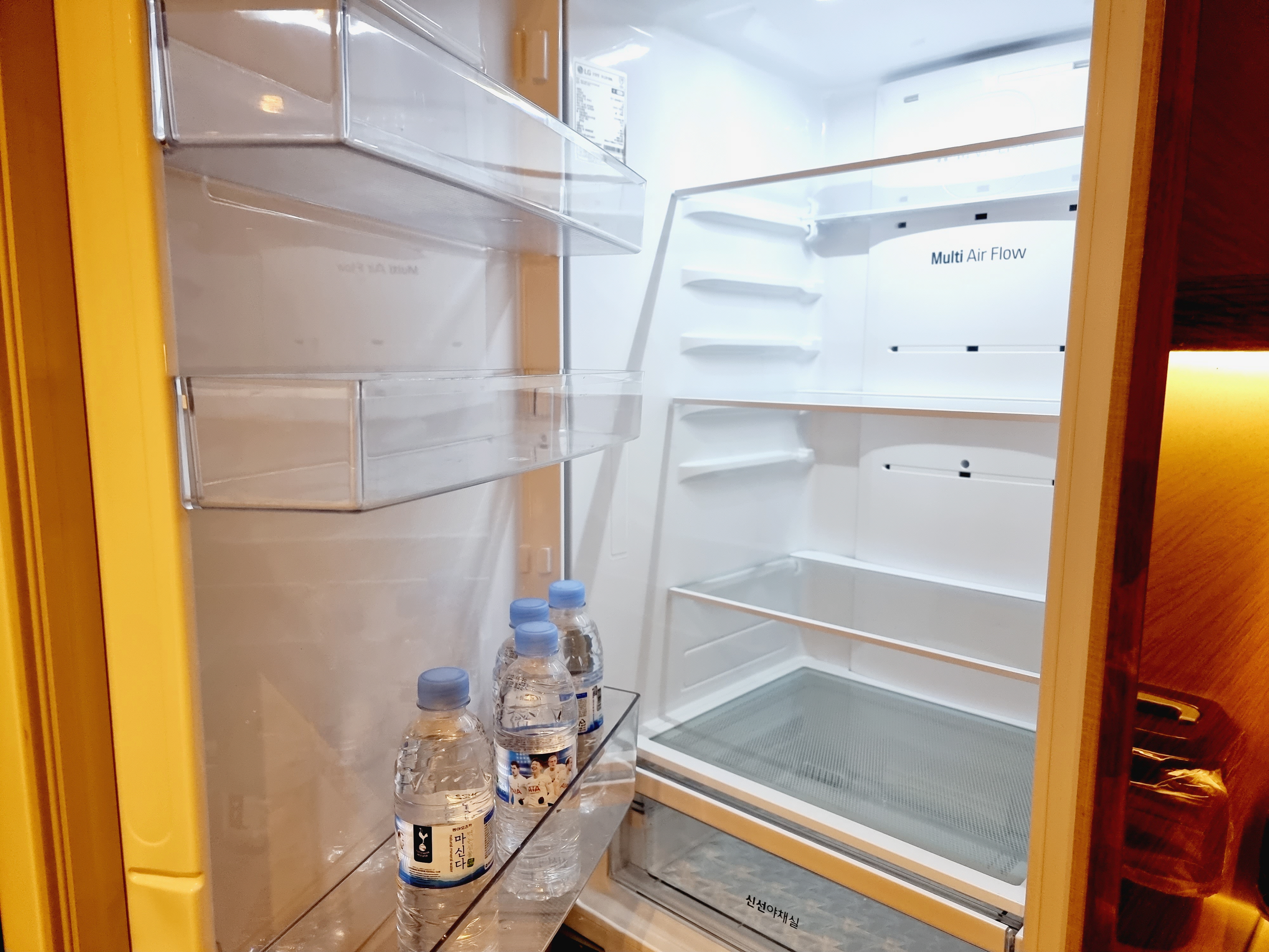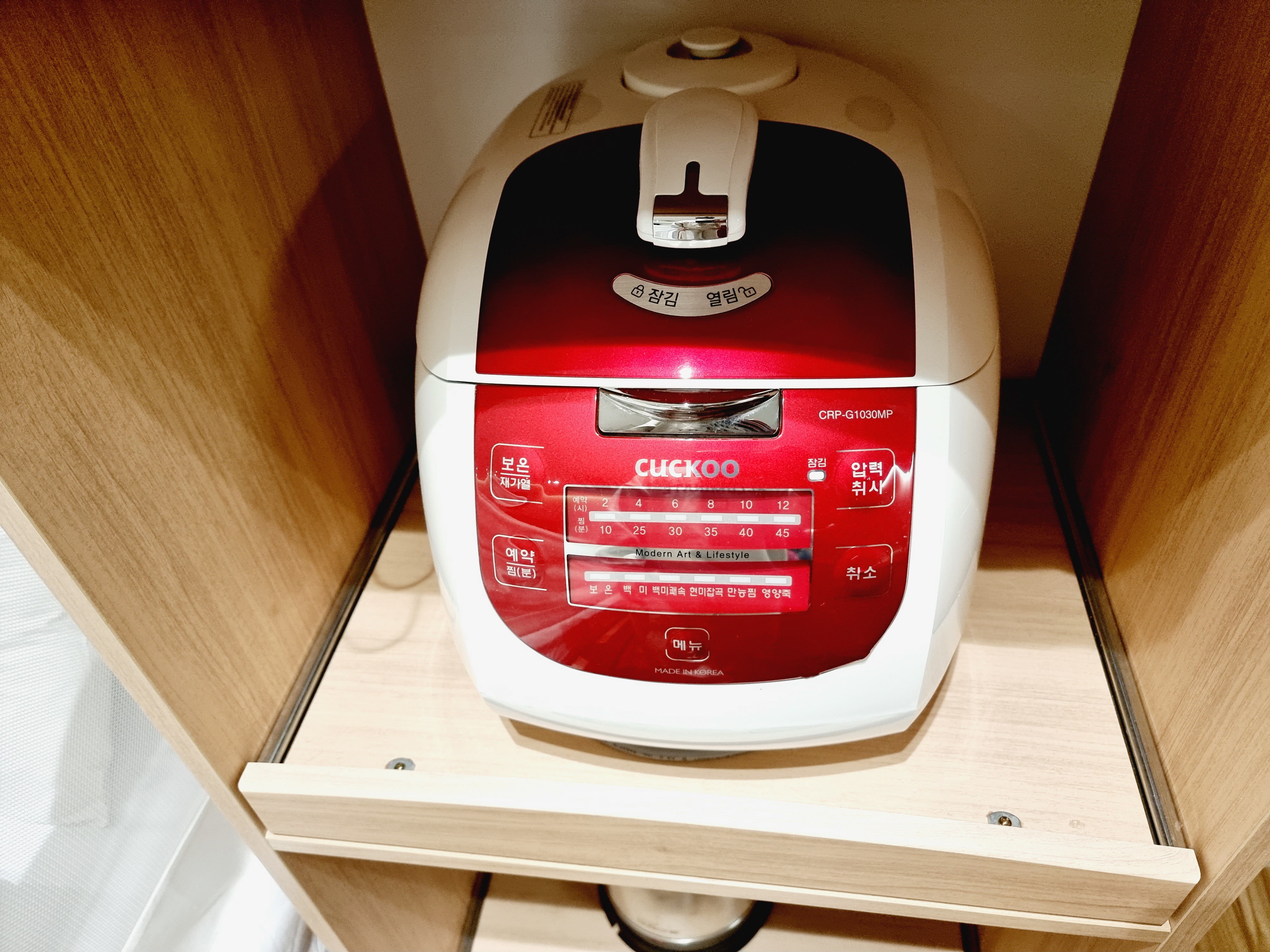 리조트의 장점은 침구는 호텔식이지만 이렇게 조리를 할 수 있는 주방공간이 있다는 점이에요. 전기밥솥과 전기포트도 있고 아이가 있는 가족에게 가장 중요한 전자레인지! 그 외에 냄비와 그릇과 같은 주방 집기류와 냉장고도 미니가 아닌 큰 냉장고라 더 좋았습니다.
