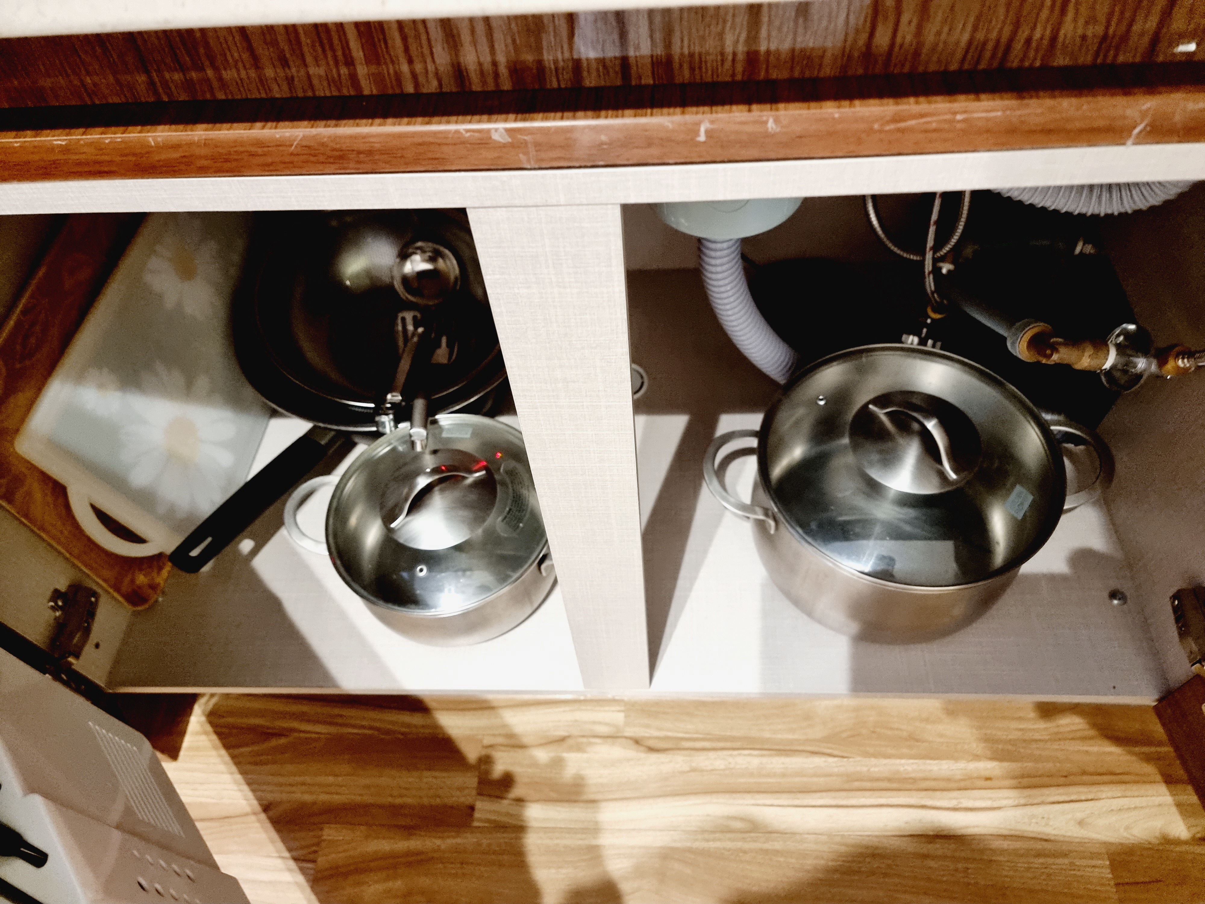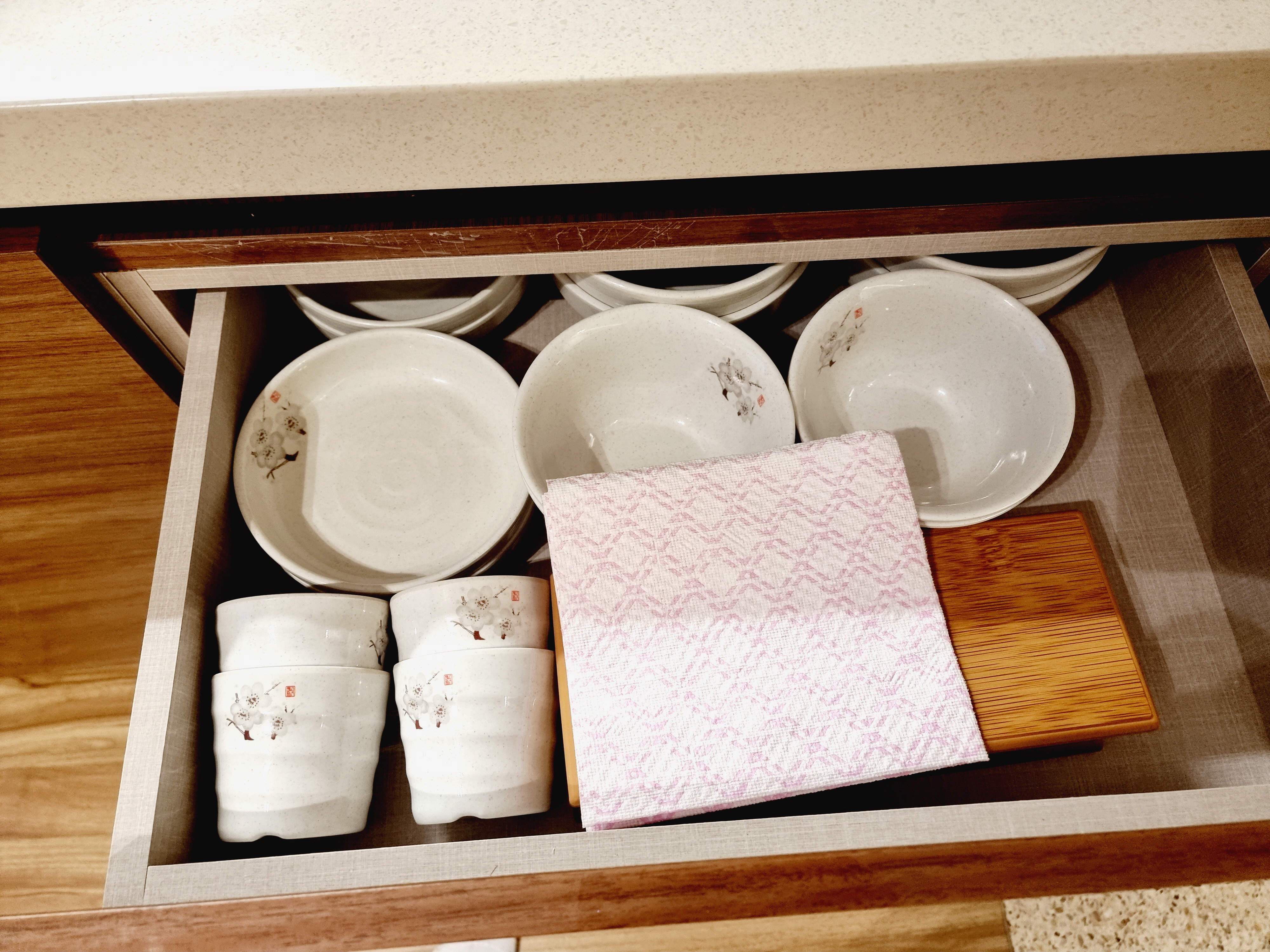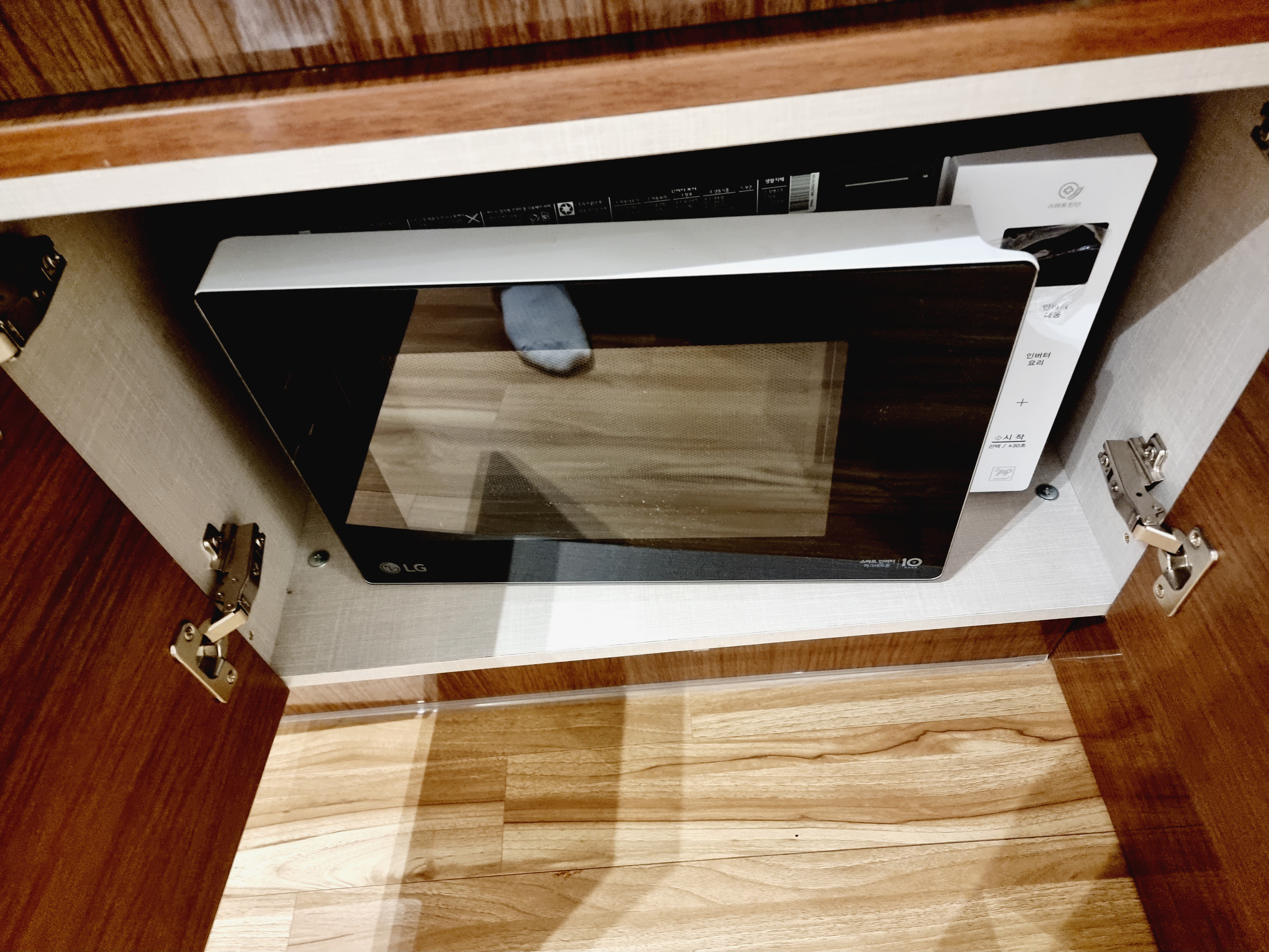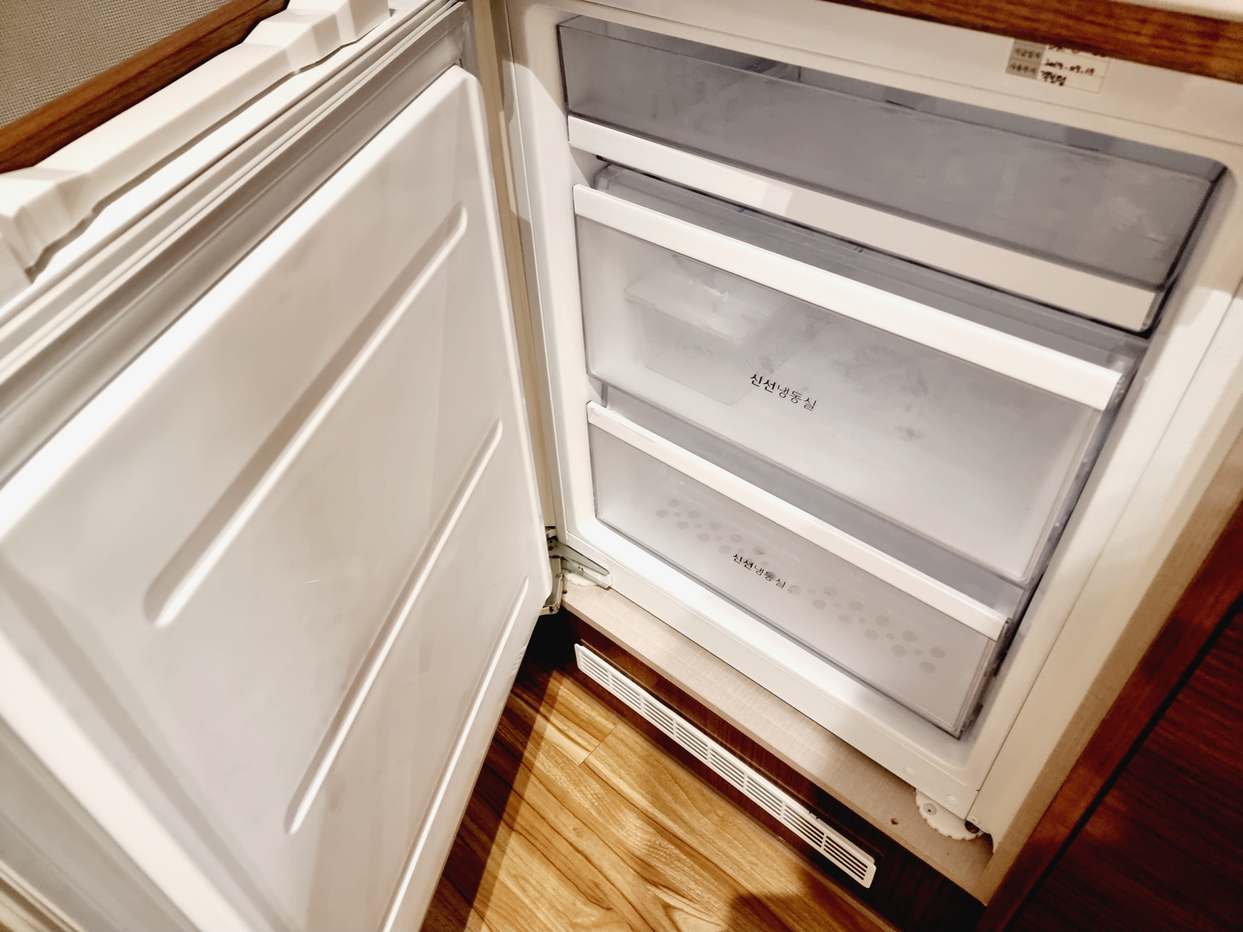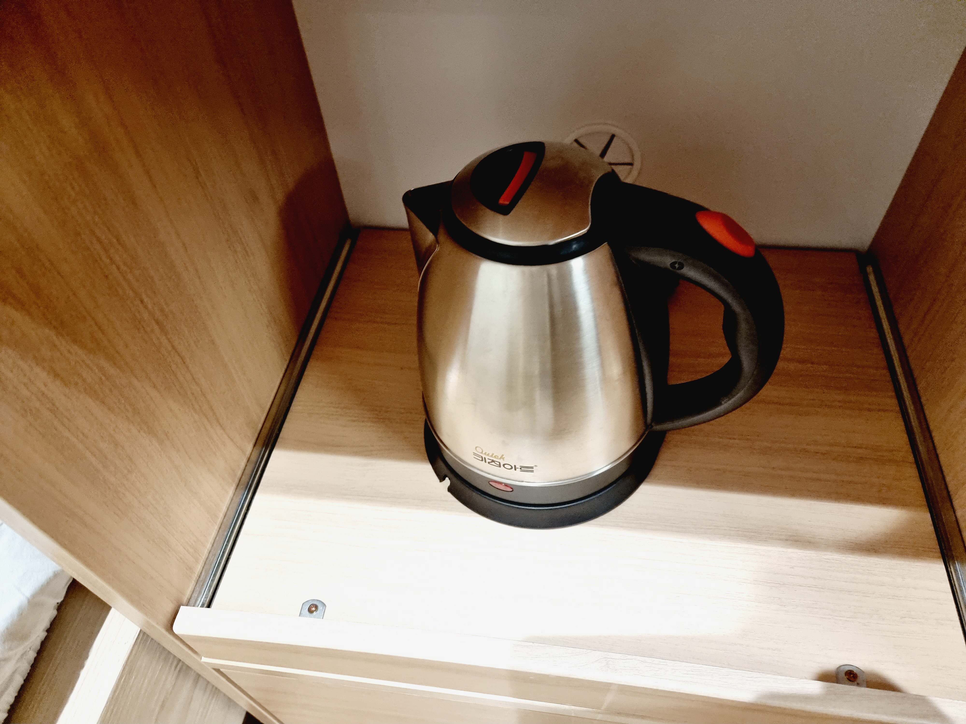 리조트의 장점은 침구는 호텔식이지만 이렇게 조리를 할 수 있는 주방공간이 있다는 점이에요. 전기밥솥과 전기포트도 있고 아이가 있는 가족에게 가장 중요한 전자레인지! 그 외에 냄비와 그릇과 같은 주방 집기류와 냉장고도 미니가 아닌 큰 냉장고라 더 좋았습니다.