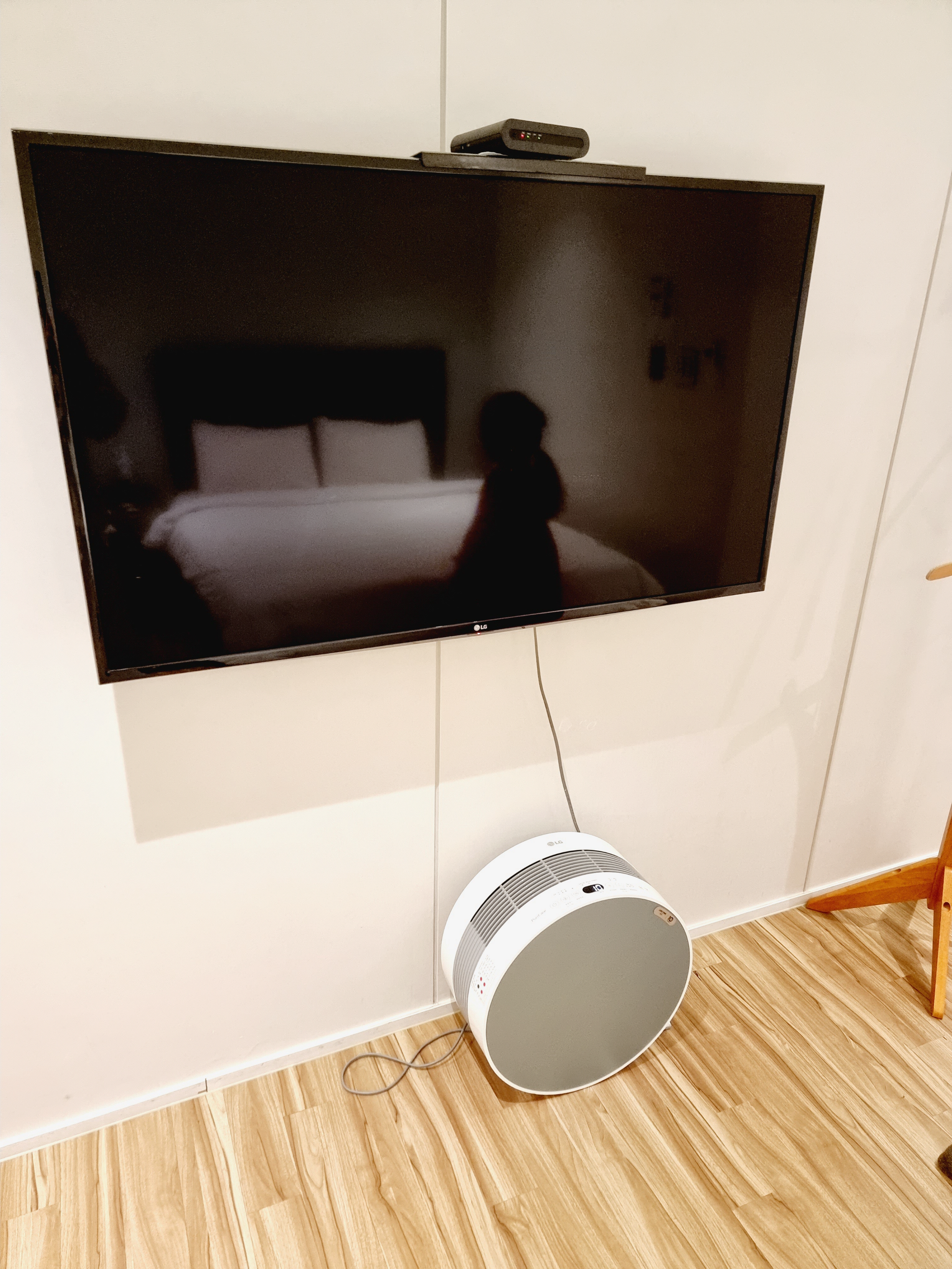 침대 앞쪽에는 이렇게 티비와 함께 공기청정기도 설치되어 있었어요.