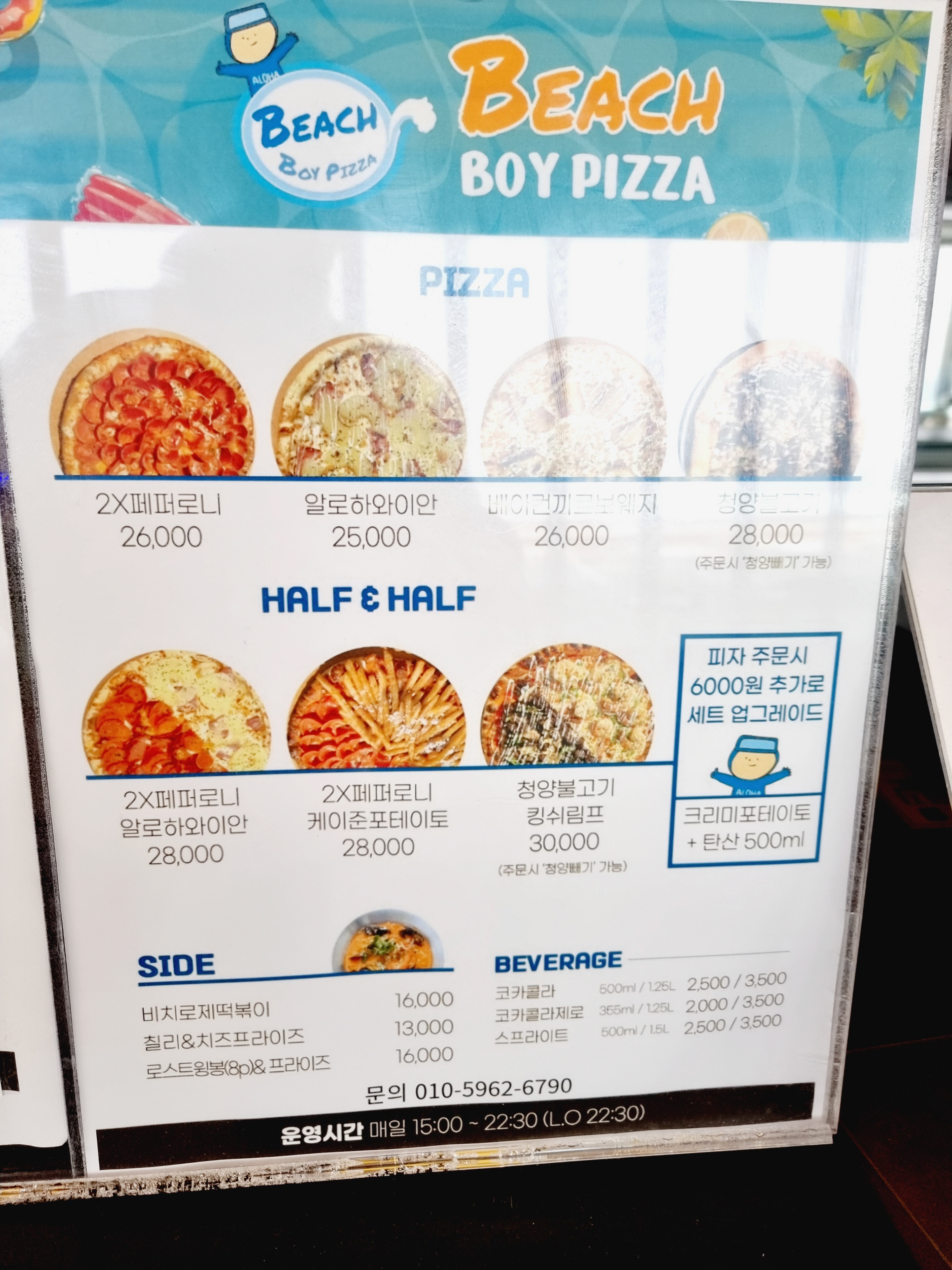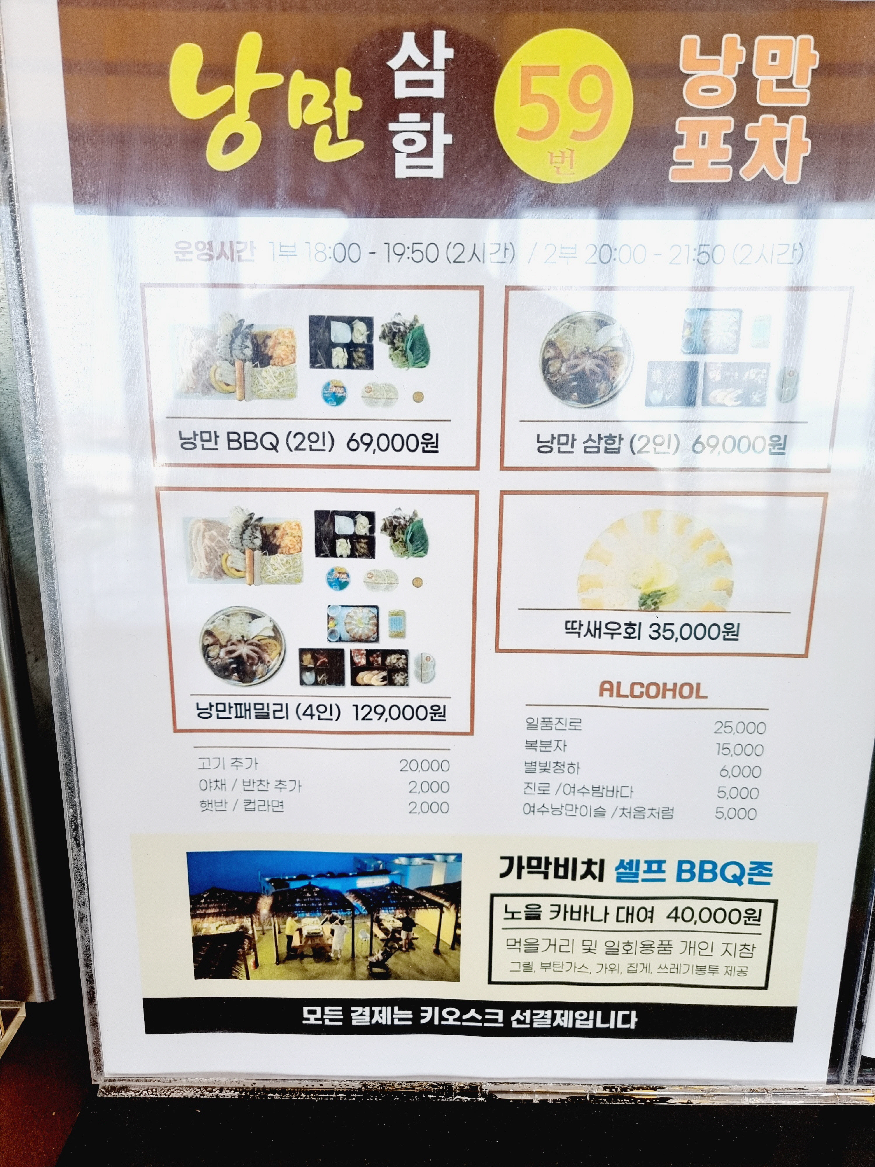 가막비치에서는 BBQ와 삼합, 딱새우회, 피자, 각종 주류와 음료를 판매하고 있습니다. 저희는 첫날에는 회를 사다먹고 둘째날에는 즐겨가는 식당이 있어서 이용은 못했지만 나가기 귀찮은 날에는 리조트내에서 편안히 식사를 하는 것도 좋을 것 같습니다.