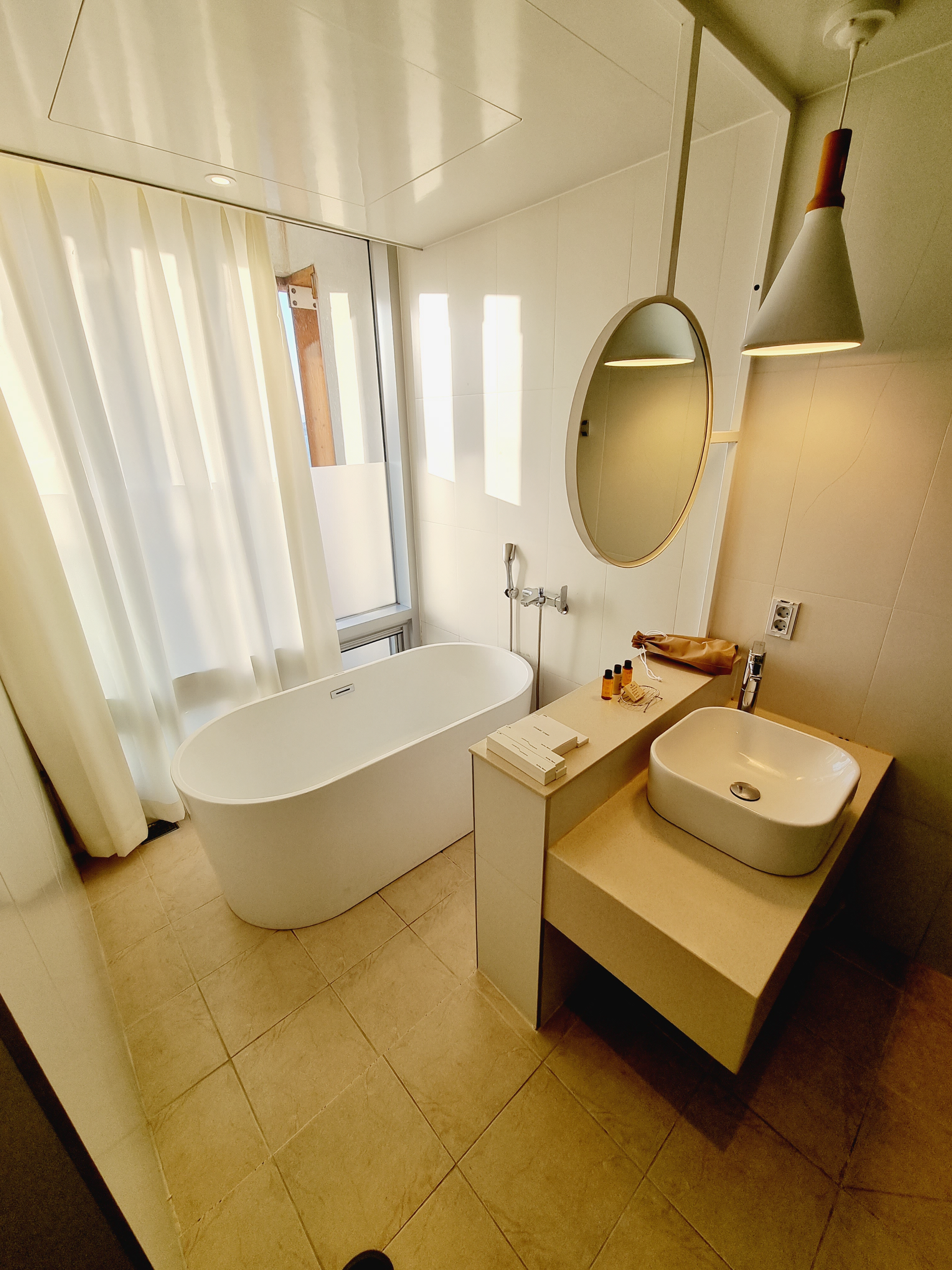 욕실에는 욕조도 있고 나름 깨끗한 편이었어요. 샴푸, 컨디셔너, 바디워시 등 어메니티와 칫솔, 빗 등도 제공됩니다. (드라이기도 있어요.)