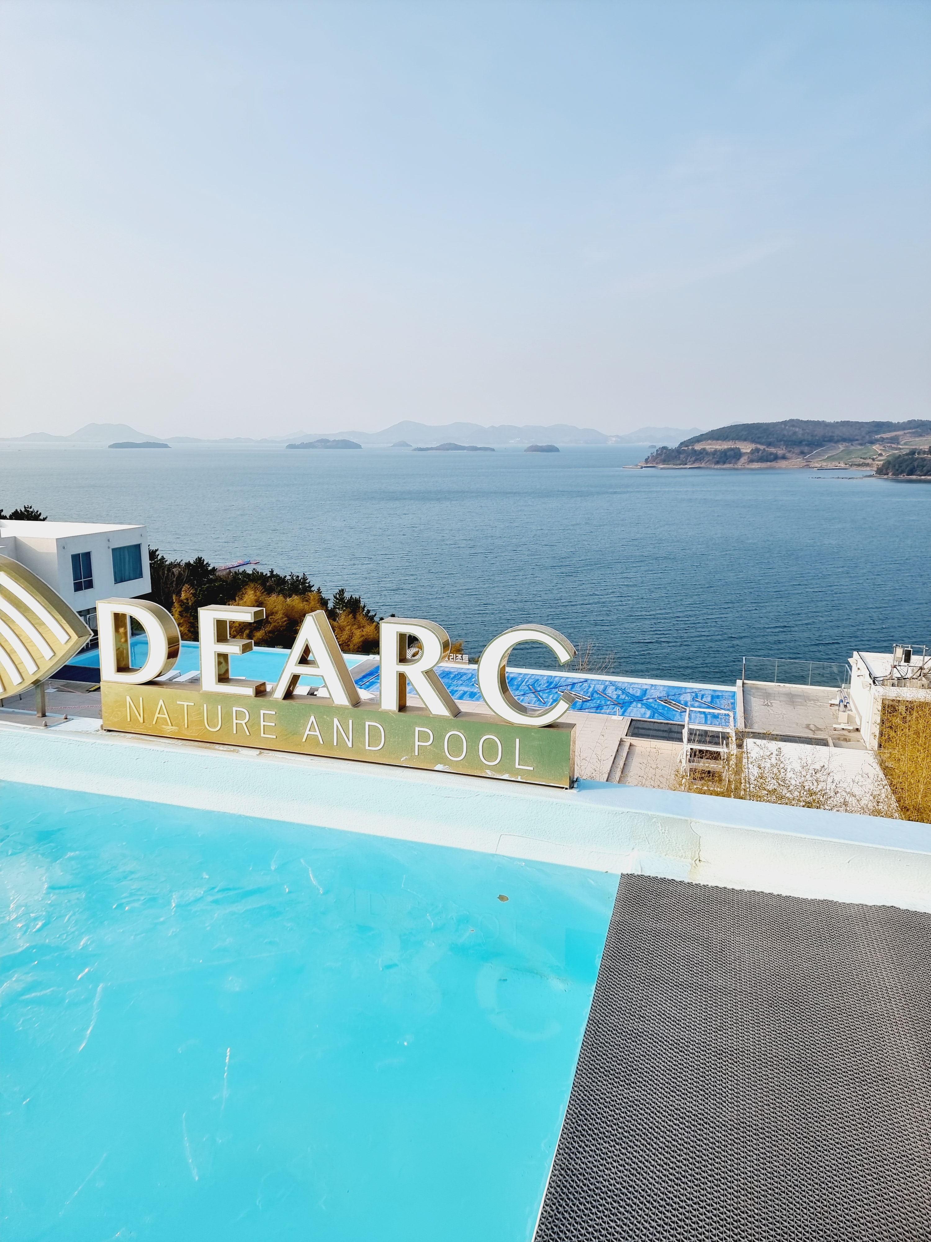 아랫쪽으로 내려가보니 디아크리조트의 하이라이트, 넓고 멋진 수영장이 기다리고 있었습니다. 겨울철 그것도 여수 바다 앞에서 즐기는 수영장이라니, 너무 멋져보였어요. 수영장은 하늘색과 파란색 2개씩 2구역으로 나뉘어져 있는데 겨울철에는 오른쪽 파란 수영장만 운영하고 있었어요. 시간은 체크인 시간인 3시부터 밤 9시까지라 오전에는 이렇게 꽁꽁 얼어붙어 있었습니다.