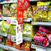 수북히 쌓인 봉지과자들~ 스윙칩과 꼬깔콘을 구입했어요.